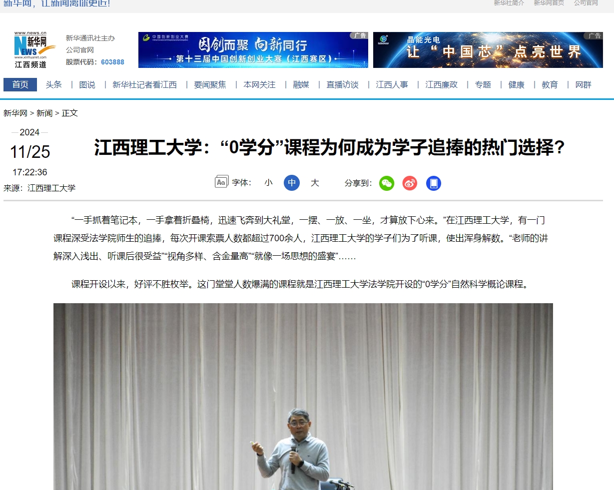 开设的《自然科学概论》“0学分”必修课程,以培养法科生对自然科学发展的基本规律的进一步了解,增加自然科学知识,学习科学精神,锻炼理性思维,推动法学与自然科学学科交叉融合发展为目的,激发学生的学习兴趣和创新精神,助力学校高质量复合型法治人才培养。
