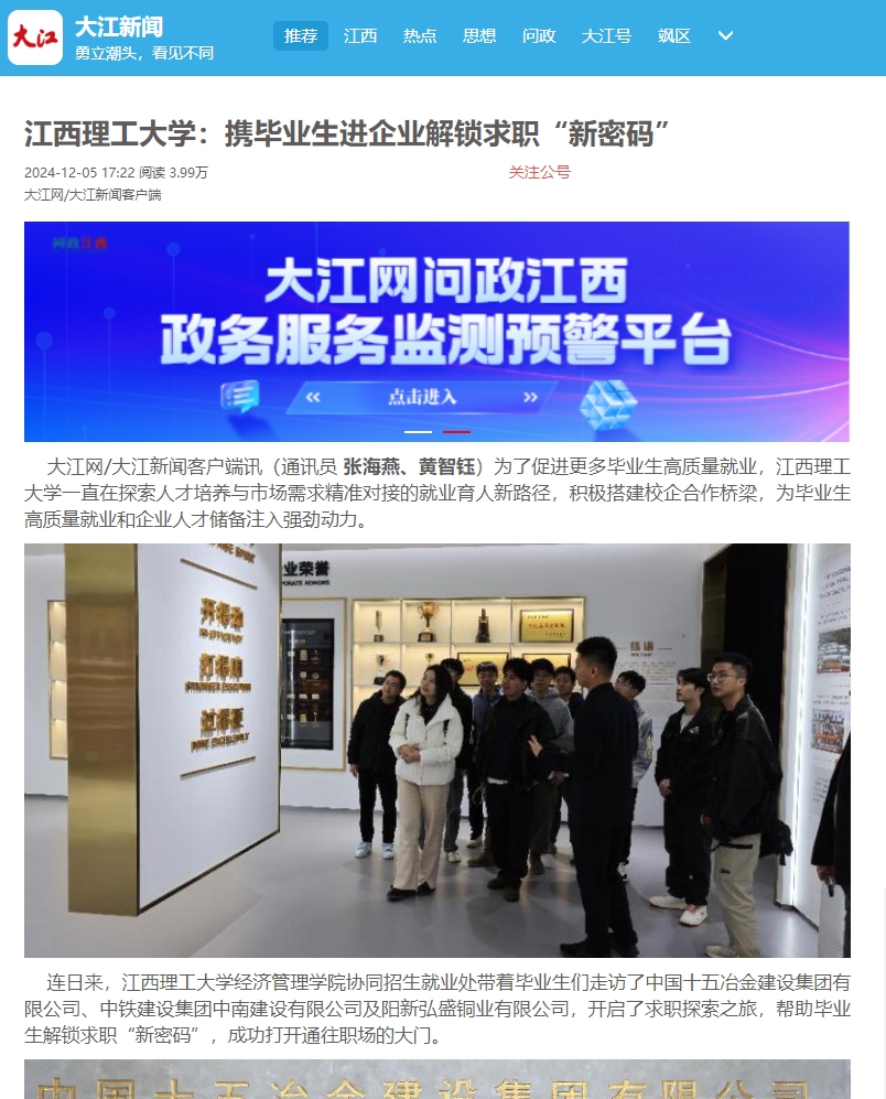 经济管理学院协同招生就业处带着毕业生们走访了中国十五冶金建设集团有限公司、中铁建设集团中南建设有限公司及阳新弘盛铜业有限公司,开启了求职探索之旅,帮助毕业生解锁求职“新密码”,成功打开通往职场的大门。