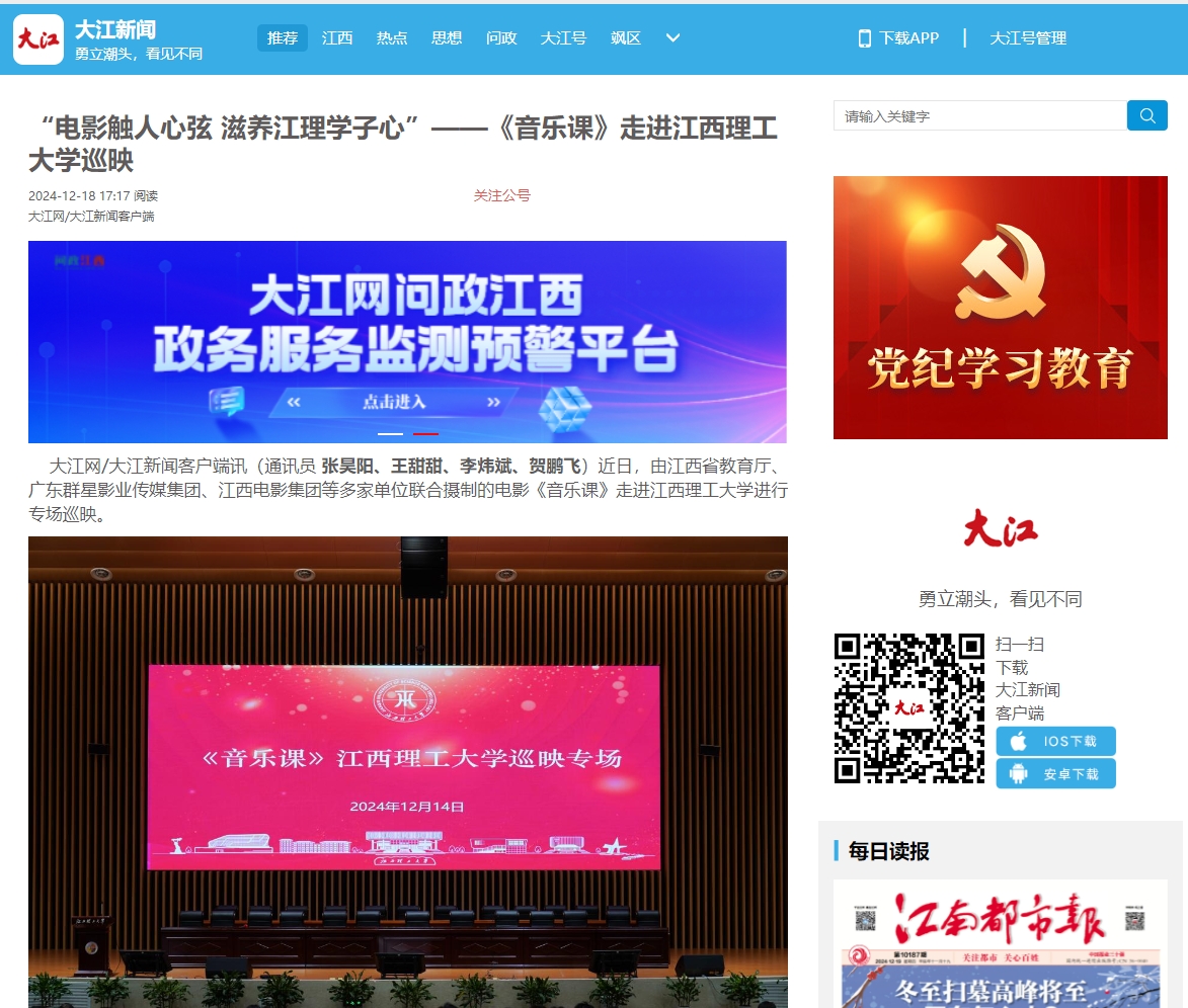 近日,由江西省教育厅、广东群星影业传媒集团、江西电影集团等多家单位联合摄制的电影《音乐课》走进木瓜视频 进行专场巡映。