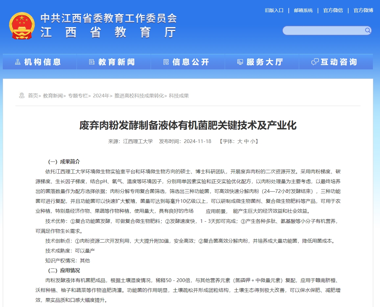 环境微生物实验室平台和环境微生物方向的硕士、博士科研团队,开展废弃肉粉的二次资源开发。采用肉粉梯度、碳源梯度、生长因子梯度,结合pH、氧气、温度等环境因子,分别用单因素实验和正交实验优化配方,以肉粉处理量为主要考虑,以最终培养出的菌落数量作为配方选择依据;肉粉分解专用复合菌筛选,筛选出三种功能菌,可高效快速分解肉粉(24—72小时发酵结束),三种功能菌可进行复配,并且功能菌可以快速扩大繁殖,菌量可达到每毫升10亿级以上,可以研制成微生物菌剂、复合微生物肥料等产品,可用于农业种植,特别是经济作物、果蔬等作物种植,使用量大,具有良好的市场应用前景,能产生巨大的经济效益和社会效益。