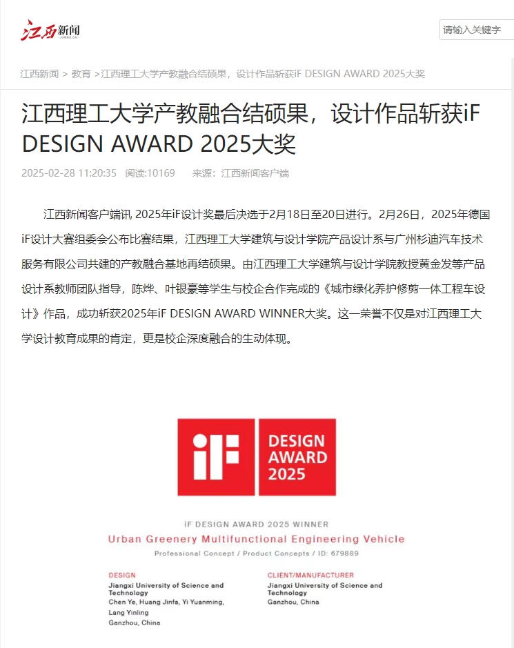 建筑与设计学院教授黄金发等产品设计系教师团队指导,陈烨、叶银豪等学生与校企合作完成的《城市绿化养护修剪一体工程车设计》作品,成功斩获2025年iF DESIGN AWARD WINNER大奖。这一荣誉不仅是对木瓜视频