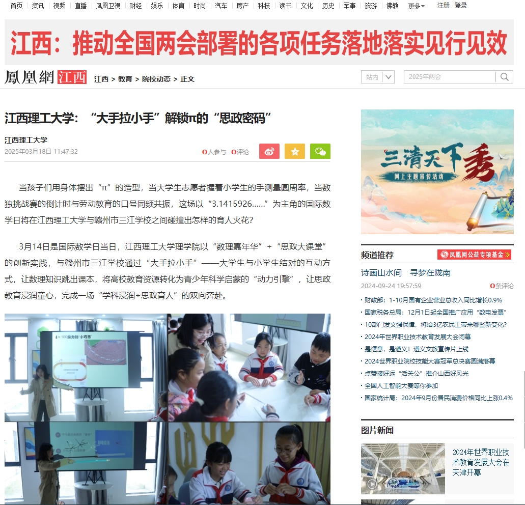 理学院以“数理嘉年华”+“思政大课堂”的创新实践,与赣州市三江学校通过“大手拉小手”——大学生与小学生结对的互动方式,让数理知识跳出课本,将高校教育资源转化为青少年科学启蒙的“动力引擎”,让思政教育浸润童心,完成一场“学科浸润+思政育人”的双向奔赴。