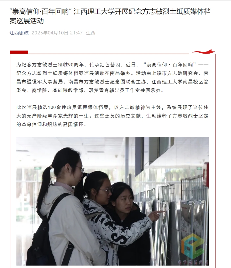 本次巡展活动通过档案展览、专题讲座等多元形式,创新了红色文化育人载体,在校园内营造了浓厚的爱国主义和理想信念教育氛围。活动不仅深化了师生对方志敏精神的理解,更让红色基因在新时代焕发出新的生机与活力,为培养担当民族复兴大任的时代新人提供了强大精神动力。