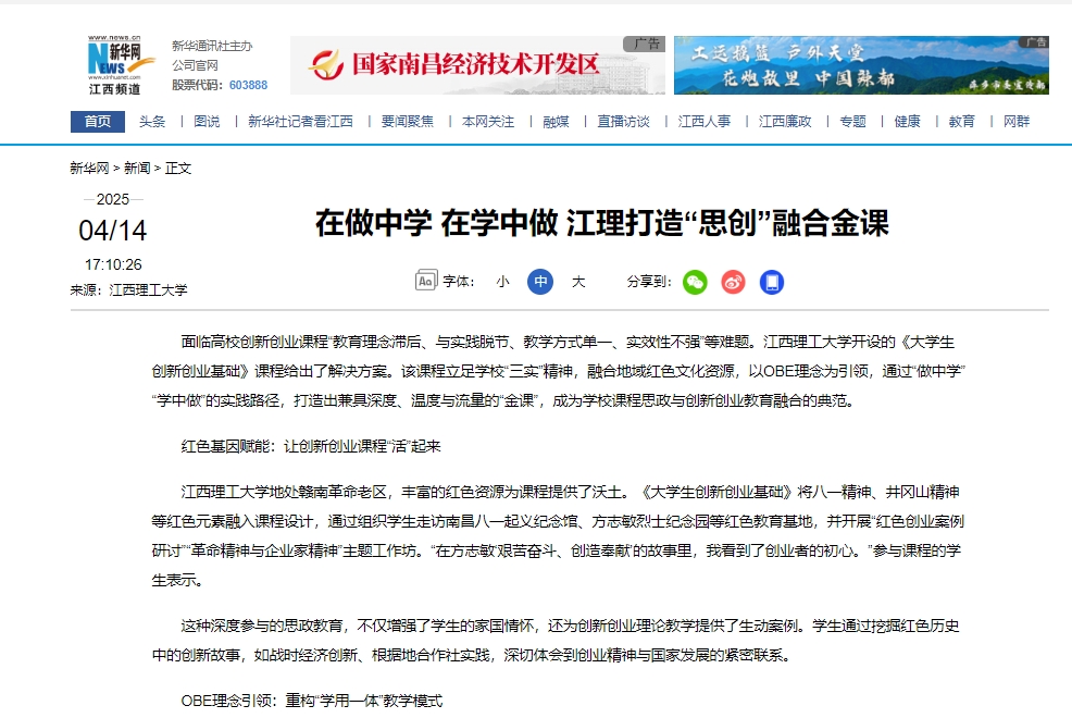 开设的《大学生创新创业基础》课程给出了解决方案。该课程立足学校“三实”精神,融合地域红色文化资源,以OBE理念为引领,通过“做中学”“学中做”的实践路径,打造出兼具深度、温度与流量的“金课”,成为学校课程思政与创新创业教育融合的典范。