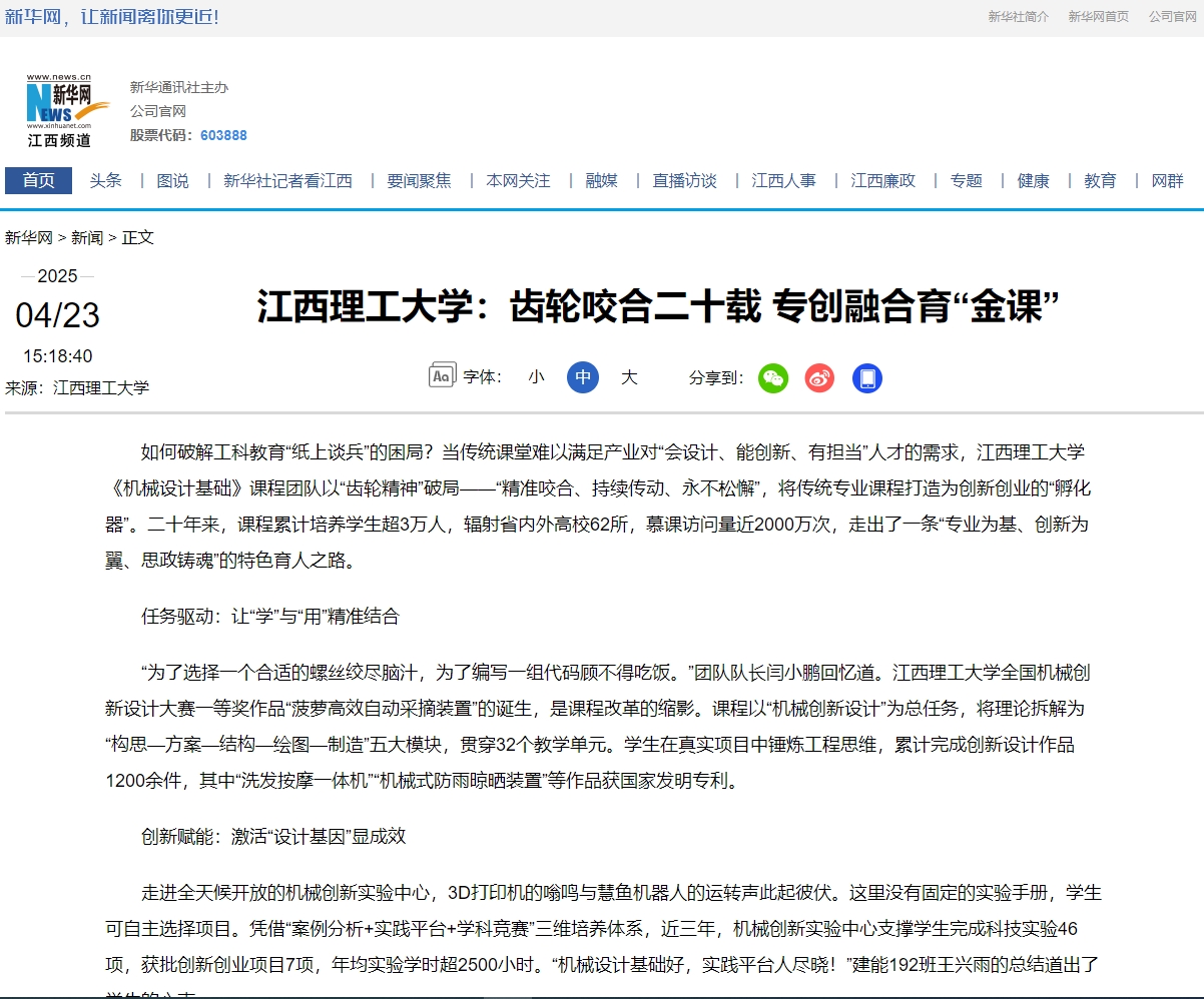 《机械设计基础》课程团队以“齿轮精神”破局——“精准咬合、持续传动、永不松懈”,将传统专业课程打造为创新创业的“孵化器”。二十年来,课程累计培养学生超3万人,辐射省内外高校62所,慕课访问量近2000万次,走出了一条“专业为基、创新为翼、思政铸魂”的特色育人之路。