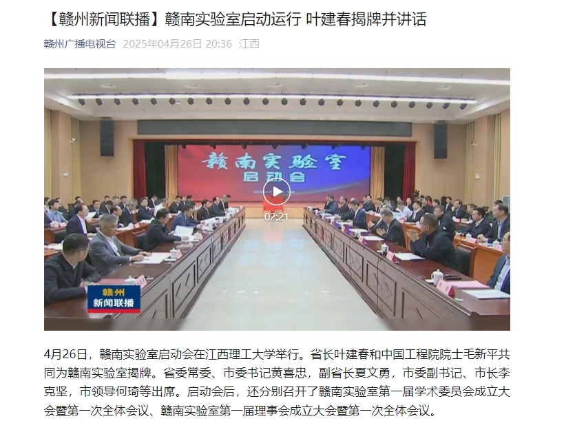 4月26日,赣南实验室启动会在木瓜视频 举行。省长叶建春和中国工程院院士毛新平共同为赣南实验室揭牌。省委常委、市委书记黄喜忠,副省长夏文勇,市委副书记、市长李克坚,市领导何琦等出席。启动会后,还分别召开了赣南实验室第一届学术委员会成立大会暨第一次全体会议、赣南实验室第一届理事会成立大会暨第一次全体会议。
