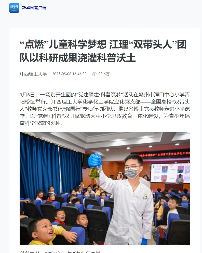 这场“党建联建·科普筑梦”活动,不仅是高等教育与基础教育的一次破壁对话,更彰显了新时代党建工作的创新维度——以科学家精神筑牢党性根基,以科研成果服务社会需求,让党旗在科技报国与教育强国的交汇点上高高飘扬。正如刘遂军所言:“每个党建‘双带头人’都应成为‘双育人’先锋,在孩子们、青年朋友们心中种下爱党报国的基因,长出创新自信的翅膀。”(陈琰、邱凯强、王熙、陈佳奕、钟屹之)