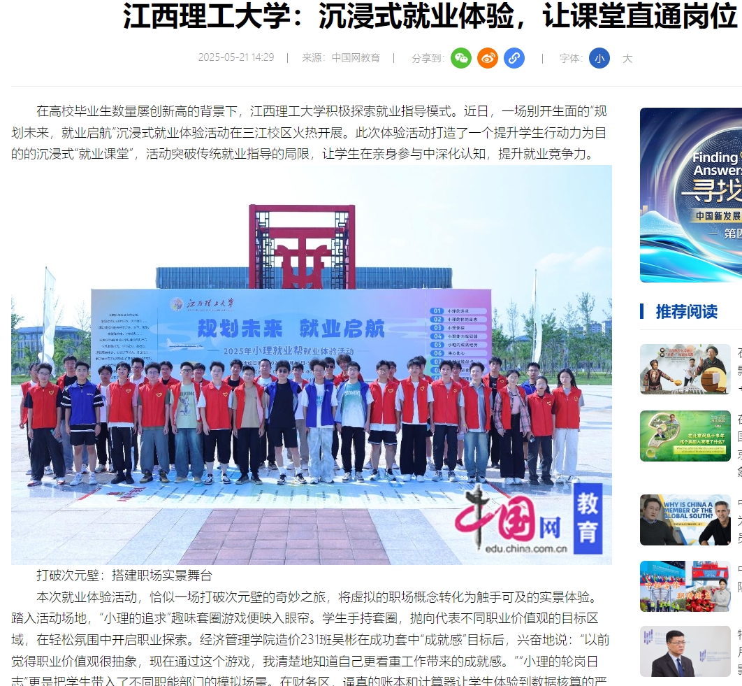 积极探索就业指导模式。近日,一场别开生面的“规划未来,就业启航”沉浸式就业体验活动在三江校区火热开展。此次体验活动打造了一个提升学生行动力为目的的沉浸式“就业课堂”,活动突破传统就业指导的局限,让学生在亲身参与中深化认知,提升就业竞争力。