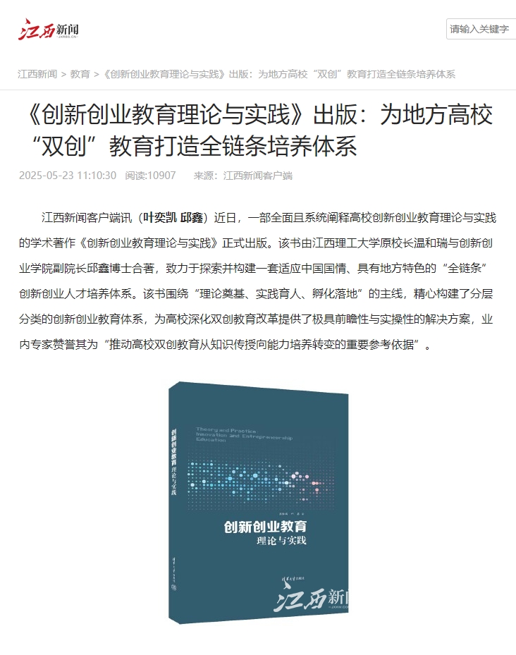江西新闻客户端讯(叶奕凯 邱鑫)近日,一部全面且系统阐释高校创新创业教育理论与实践的学术著作《创新创业教育理论与实践》正式出版。该书由木瓜视频