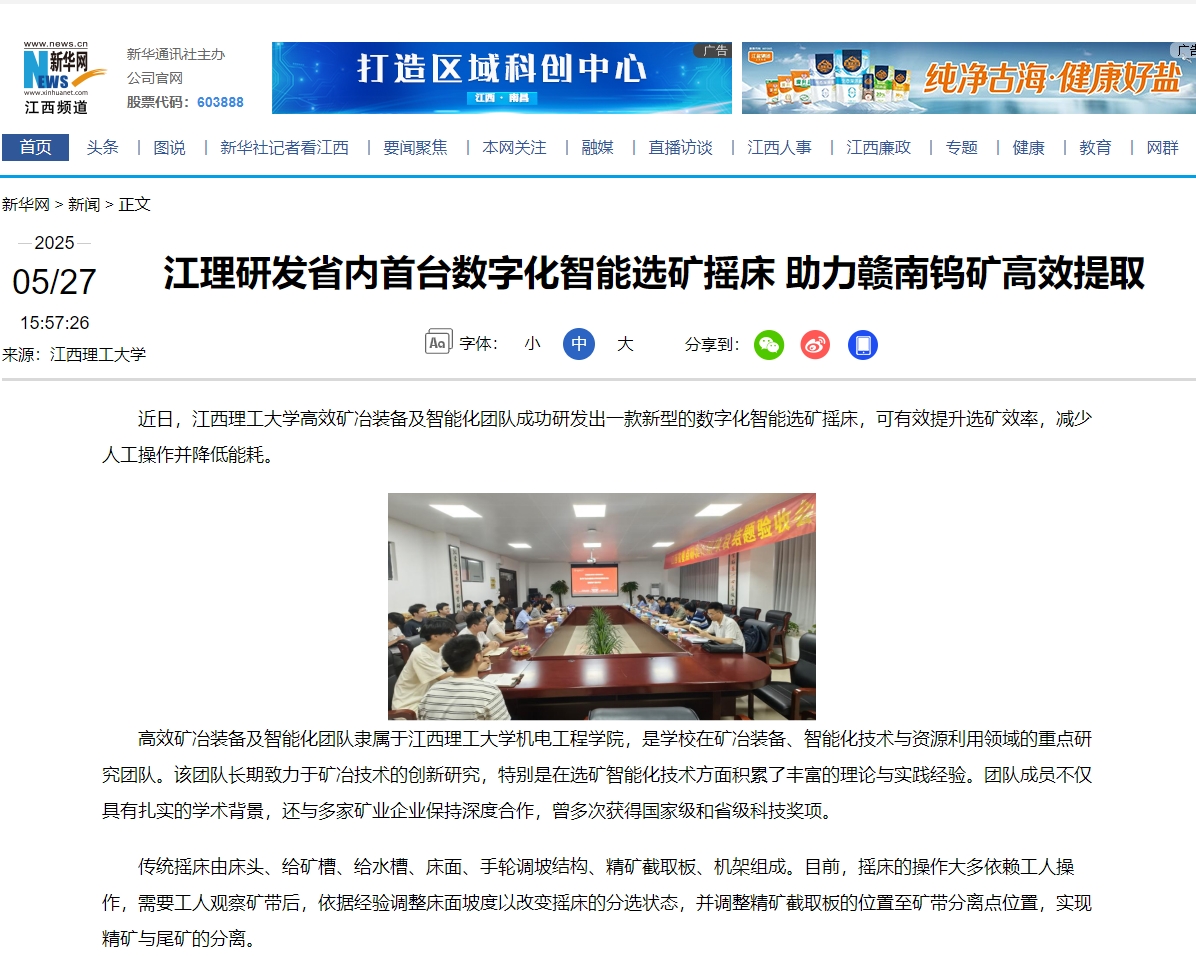 目前,新型数字化智能选矿摇床已经在实验室和矿山等场景进行测试,表现良好、性能指标稳定。团队指导老师刘惠中教授表示,这一创新成果不仅为矿业装备行业带来了更高效、更智能的解决方案,也为国内外选矿产业提供了技术参考,推动了矿业行业向绿色、高效、智能化方向发展。未来,团队将继续深化研究,推动选矿行业的数字化转型,助力矿业行业的持续发展与升级。(汤佳美、陈思凯、范启庆)