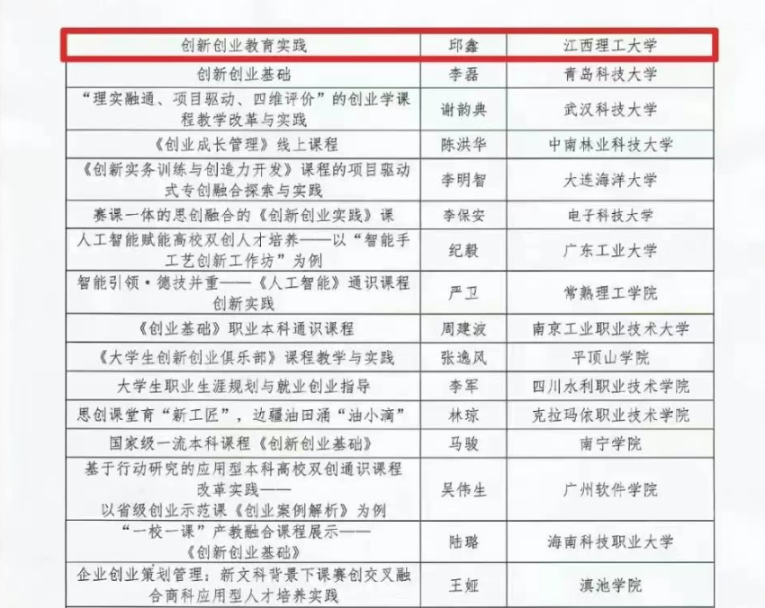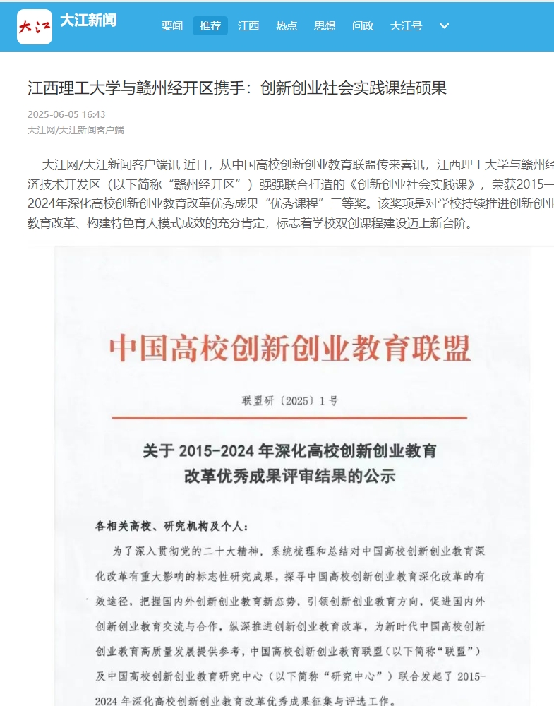 与赣州经济技术开发区(以下简称“赣州经开区”)强强联合打造的《创新创业社会实践课》,荣获2015—2024年深化高校创新创业教育改革优秀成果“优秀课程”三等奖。该奖项是对学校持续推进创新创业教育改革、构建特色育人模式成效的充分肯定,标志着学校双创课程建设迈上新台阶。