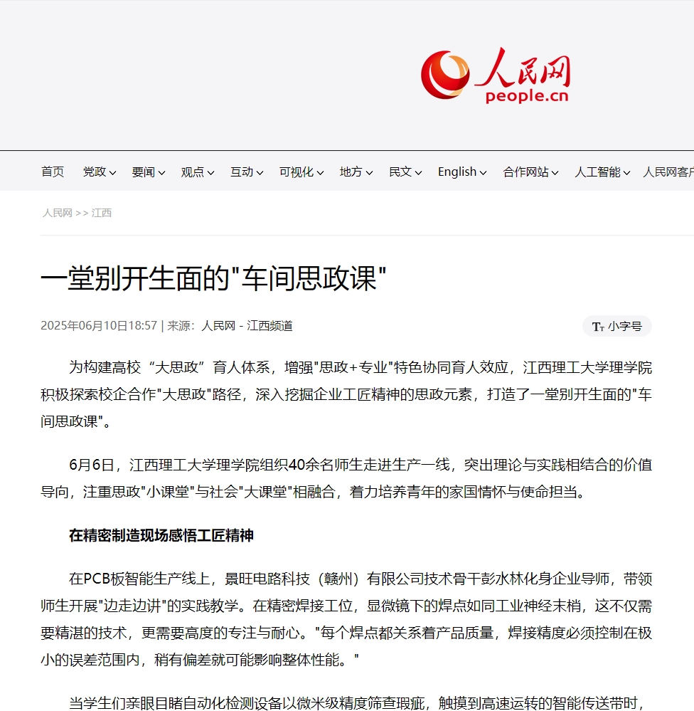 在PCB板智能生产线上,景旺电路科技(赣州)有限公司技术骨干彭水林化身企业导师,带领师生开展"边走边讲"的实践教学。在精密焊接工位,显微镜下的焊点如同工业神经末梢,这不仅需要精湛的技术,更需要高度的专注与耐心。"每个焊点都关系着产品质量,焊接精度必须控制在极小的误差范围内,稍有偏差就可能影响整体性能。"