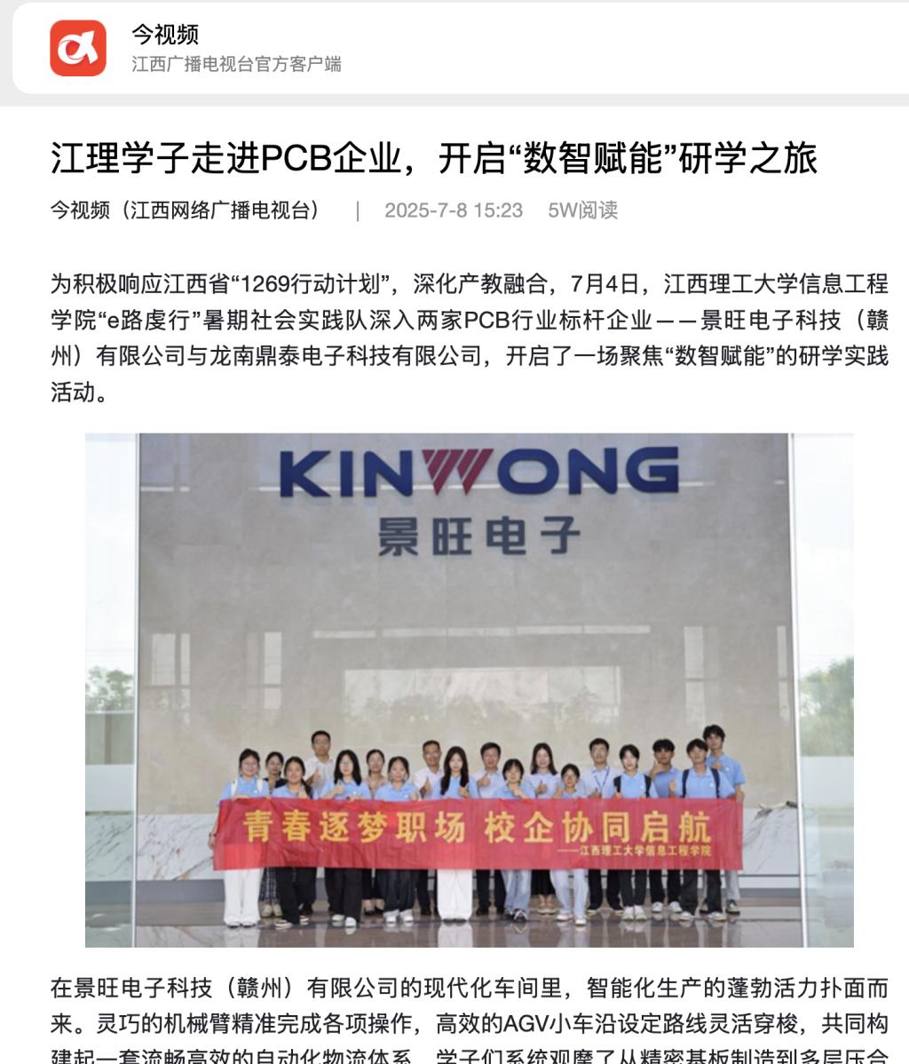 信息工程学院“e路虔行”暑期社会实践队深入两家PCB行业标杆企业——景旺电子科技(赣州)有限公司与龙南鼎泰电子科技有限公司,开启了一场聚焦“数智赋能”的研学实践活动。