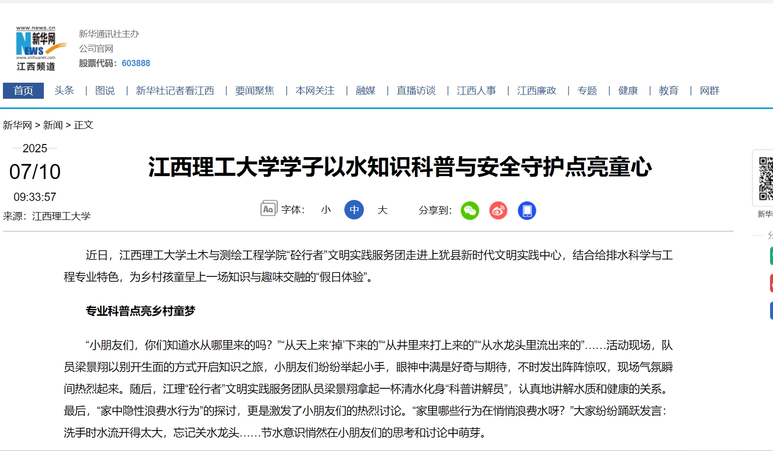 “砼行者”文明实践服务团将给排水专业知识转化为通俗易懂的科普内容,既丰富了乡村儿童的暑期生活,更在他们心中播下科学、环保与安全的种子。“砼行者”将继续步履不停,以青春之力为乡村发展注入更多活力、贡献青春力量。(程霜、周治发、王维彤)