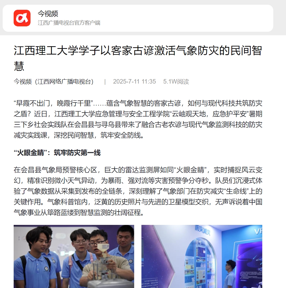 应急管理与安全工程学院“云岫观天地,应急护平安”暑期三下乡社会实践队在会昌县与寻乌县带来了融合古老农谚与现代气象监测科技的防灾减灾实践课,深挖民间智慧,筑牢安全防线。