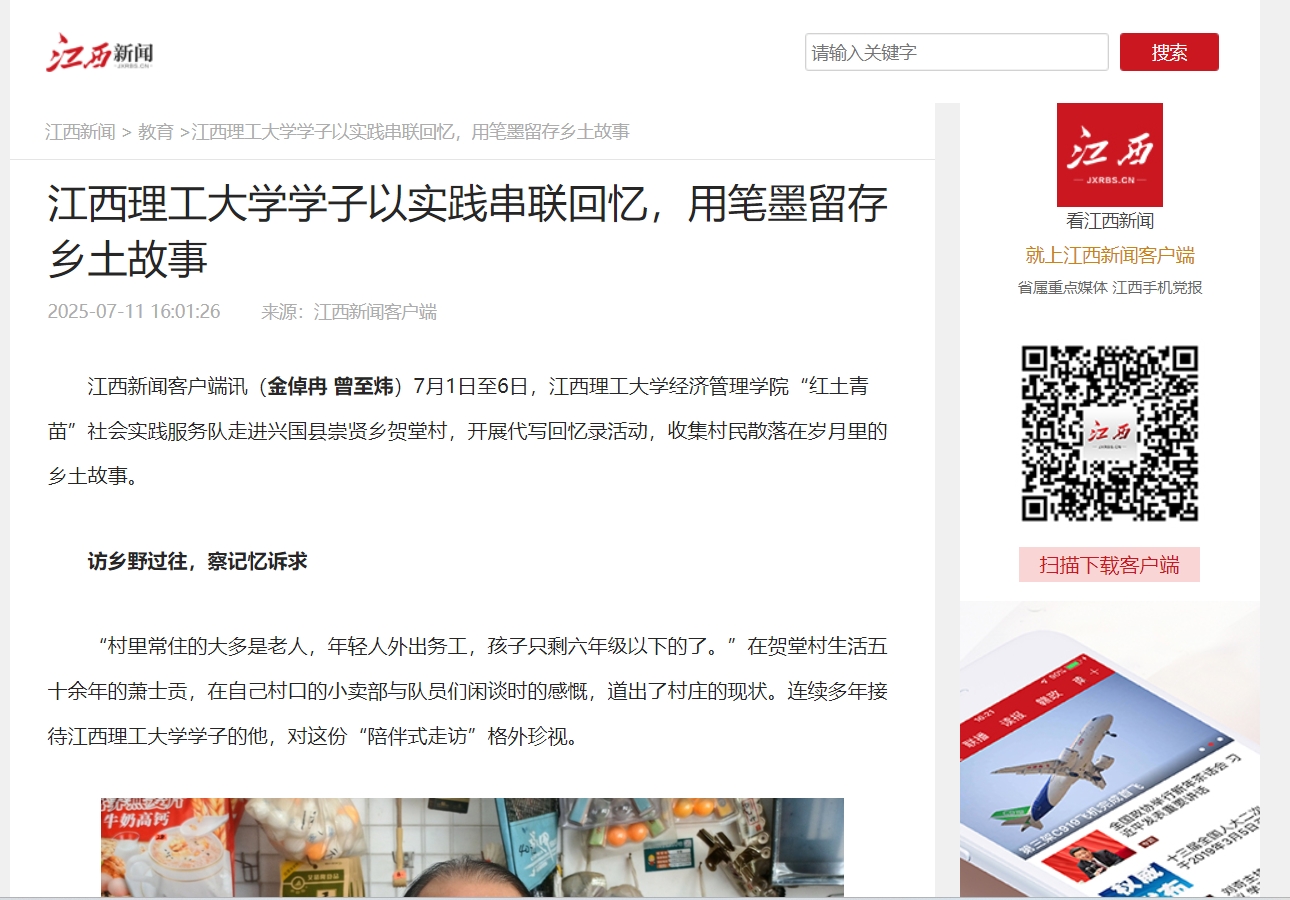 经济管理学院“红土青苗”社会实践服务队走进兴国县崇贤乡贺堂村,开展代写回忆录活动,收集村民散落在岁月里的乡土故事。