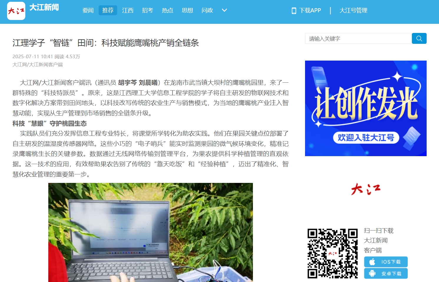 信息工程学院此次社会实践活动,精准聚焦科技助力乡村振兴。团队深度应用物联网感知、数据传输、移动互联网等前沿技术,系统性赋能农产品生产与销售全链条。他们以智慧监测优化生产管理,通过直播电商拓展市场销路,并凭借独创的溯源体系筑牢品质信任。这不仅为龙南鹰嘴桃产业插上了数字化翅膀,有效促进了农民增收,更探索出一条可复制、可推广的“高校智慧助农”新路径,充分彰显了新时代青年学子学以致用、服务社会、贡献乡村的责任担当。