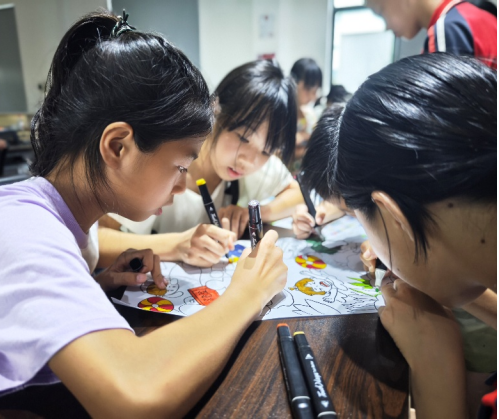 ▲孩子们为防溺水海报填色涂鸦 摄影丨李展翼