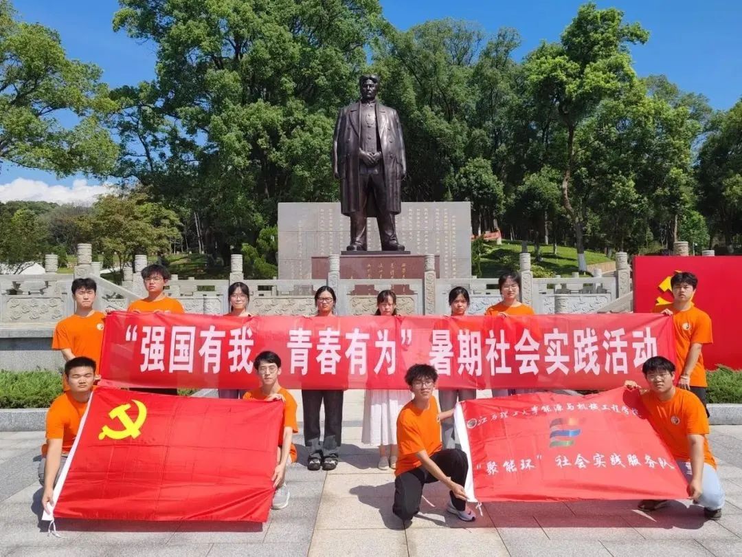 首站,“聚能环”社会实践服务队赴南昌市方志敏烈士陵园开展“强国有我,青春有为”主题实践。队员们在烈士墓前列队肃立,瞻仰“方志敏烈士永垂不朽”金色碑文,深切缅怀革命先驱的赤诚担当。纪念馆内,泛黄的手稿、珍贵的历史照片与复原的革命场景,生动再现了方志敏同志坚守信仰的峥嵘岁月。活动尾声,全体队员在方志敏塑像前拉起主题横幅,以坚定目光宣誓赓续红色精神。
