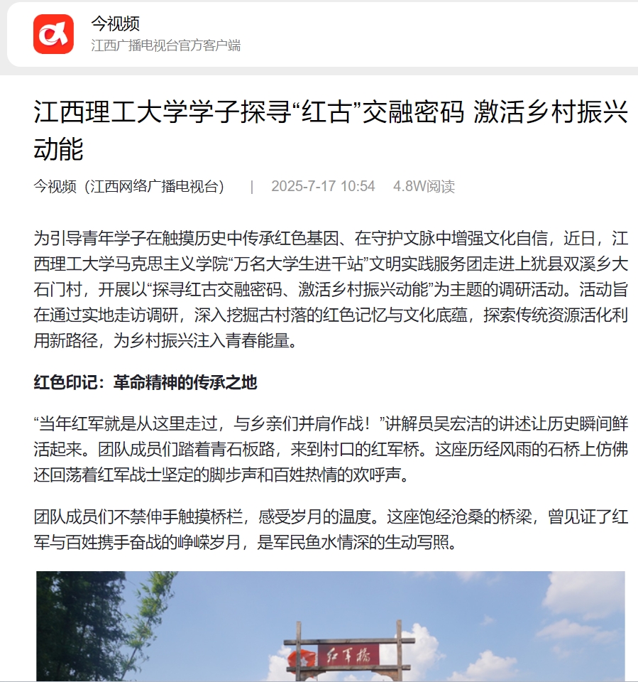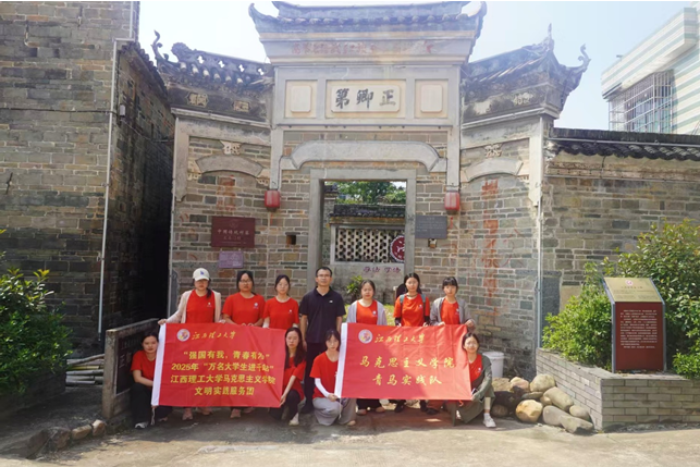 马克思主义学院“万名大学生进千站”文明实践服务团走进上犹县双溪乡大石门村,开展以“探寻红古交融密码、激活乡村振兴动能”为主题的调研活动。活动旨在通过实地走访调研,深入挖掘古村落的红色记忆与文化底蕴,探索传统资源活化利用新路径,为乡村振兴注入青春能量。