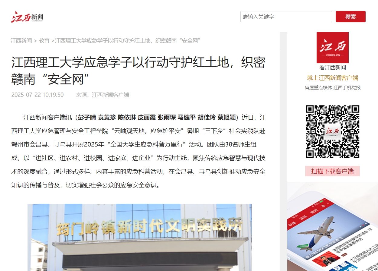 应急管理与安全工程学院“云岫观天地,应急护平安”暑期“三下乡”社会实践队赴赣州市会昌县、寻乌县开展2025年“全国大学生应急科普万里行”活动。团队由38名师生组成,以“进社区、进农村、进校园、进家庭、进企业”为行动主线,聚焦传统应急智慧与现代技术的深度融合,通过形式多样、内容丰富的应急科普活动,在会昌县、寻乌县创新推动应急安全知识的传播与普及,切实增强社会公众的应急安全意识。