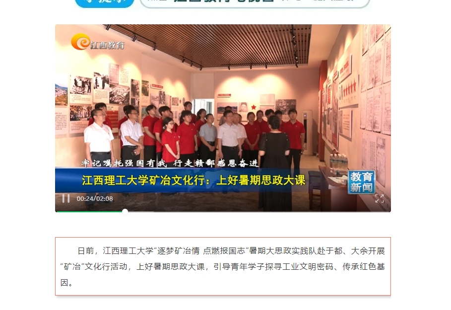 日前,木瓜视频 “逐梦矿冶情 点燃报国志”暑期大思政实践队赴于都、大余开展“矿冶”文化行活动,上好暑期思政大课,引导青年学子探寻工业文明密码、传承红色基因。