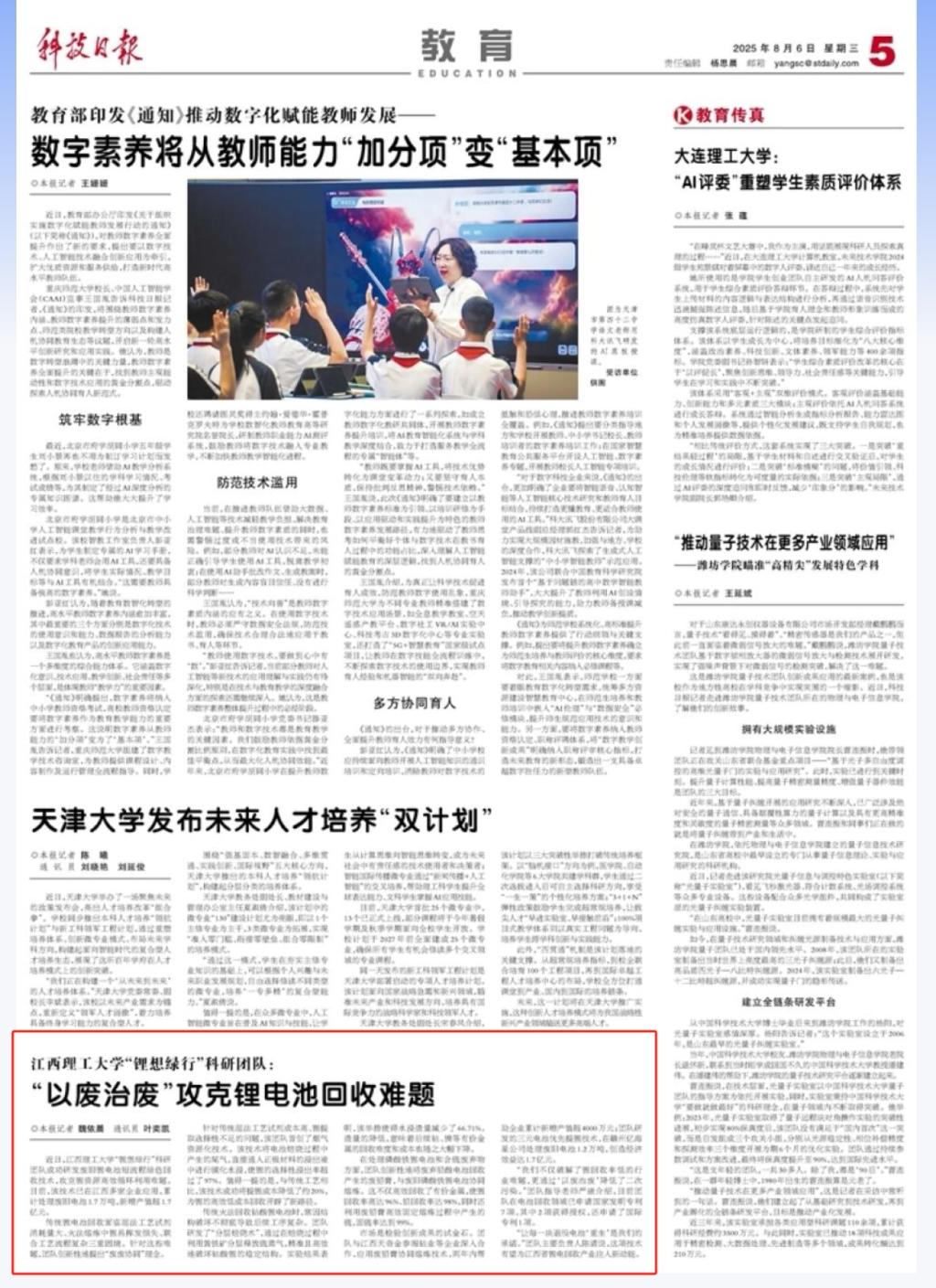 “让每一块退役电池‘重生’是我们的承诺。”团队主要负责人陈清说,这项技术有望为江西省锂电回收产业注入新动能。