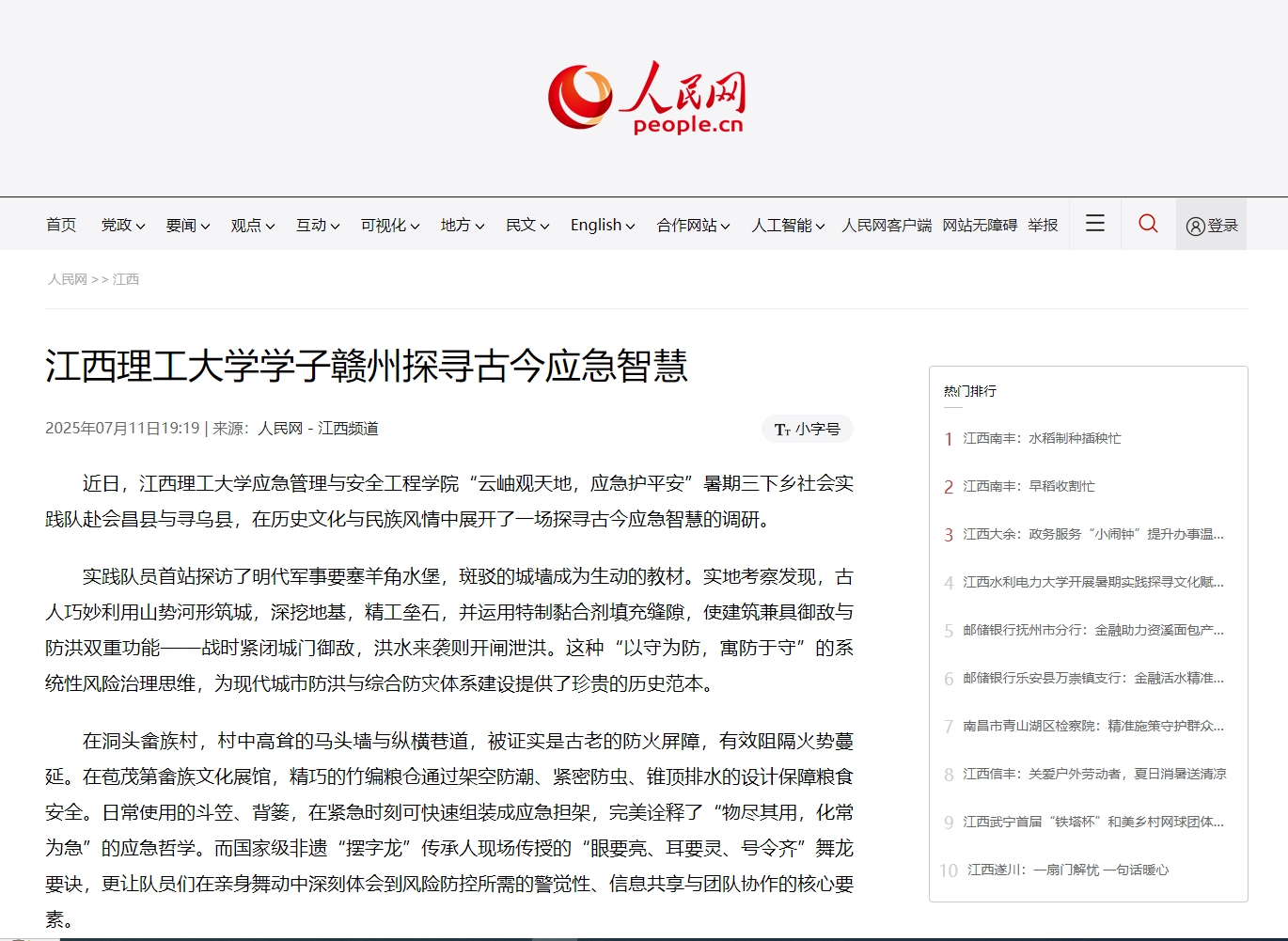 应急管理与安全工程学院“云岫观天地,应急护平安”暑期三下乡社会实践队赴会昌县与寻乌县,在历史文化与民族风情中展开了一场探寻古今应急智慧的调研。