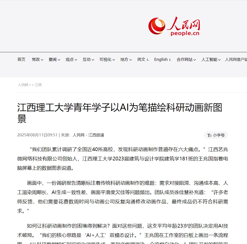 如何让科研动画制作的困境得到解决?面对这些问题,这支平均年龄23岁的团队决定用AI技术破局。“我们的核心思路是‘AI+人工’双模态设计。”王兆国在工作室的白板上画出一条流程图,“从科研数据解析到可视化动画生成,再到多终端渲染,全流程自动化。”团队开发的智能平台搭载了自然语言处理技术,可自动生成脚本;多模态算法根据科研数据和脚本快速生成初步草图。