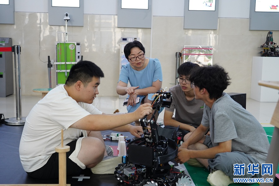 学生在老师常军然指导下,调试自动分拣机器人。新华网 王中庆 摄