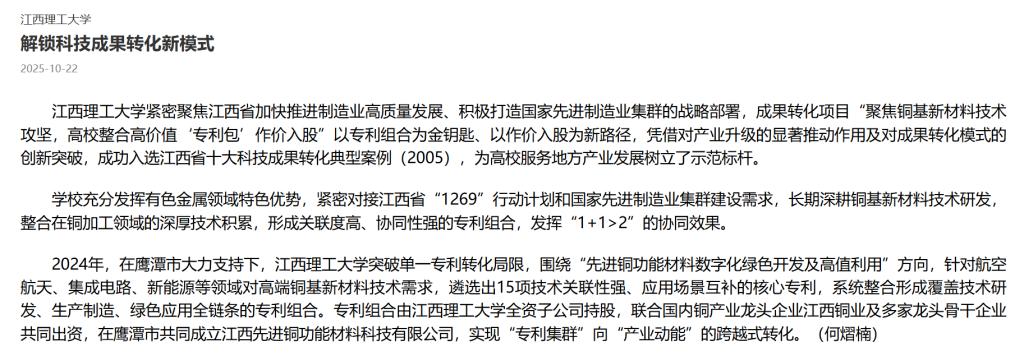 紧密聚焦江西省加快推进制造业高质量发展、积极打造国家先进制造业集群的战略部署,成果转化项目“聚焦铜基新材料技术攻坚,高校整合高价值‘专利包’作价入股”以专利组合为金钥匙、以作价入股为新路径,凭借对产业升级的显著推动作用及对成果转化模式的创新突破,成功入选江西省十大科技成果转化典型案例(2025),为高校服务地方产业发展树立了示范标杆。