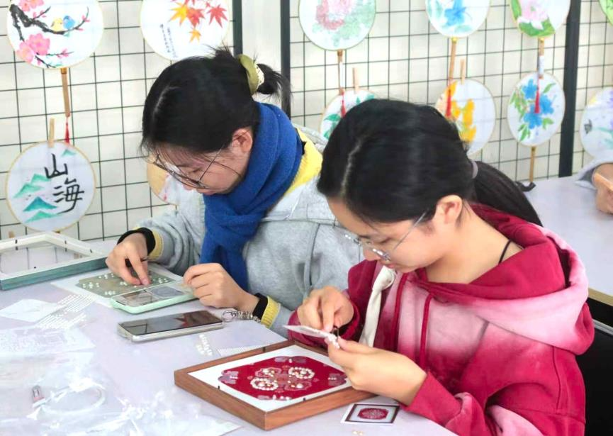 学生制作宋锦珍珠画 摄影丨王雨欣