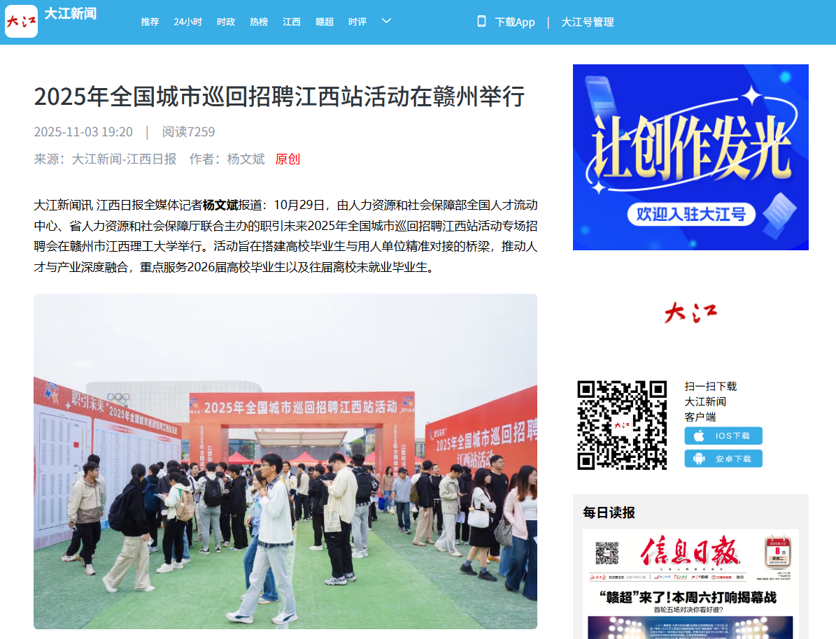 大江新闻讯 江西日报全媒体记者杨文斌报道:10月29日,由人力资源和社会保障部全国人才流动中心、省人力资源和社会保障厅联合主办的职引未来2025年全国城市巡回招聘江西站活动专场招聘会在赣州市木瓜视频 举行。活动旨在搭建高校毕业生与用人单位精准对接的桥梁,推动人才与产业深度融合,重点服务2026届高校毕业生以及往届离校未就业毕业生。