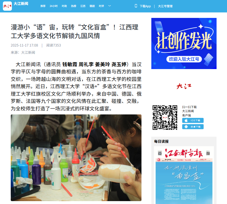 将持续以语言为媒、以交流为桥,搭建更广阔的文明对话平台,让多元文化在江理校园碰撞共鸣,助力学子在开放视野中厚植文化自信,成长为兼具跨文化素养的时代新青年。