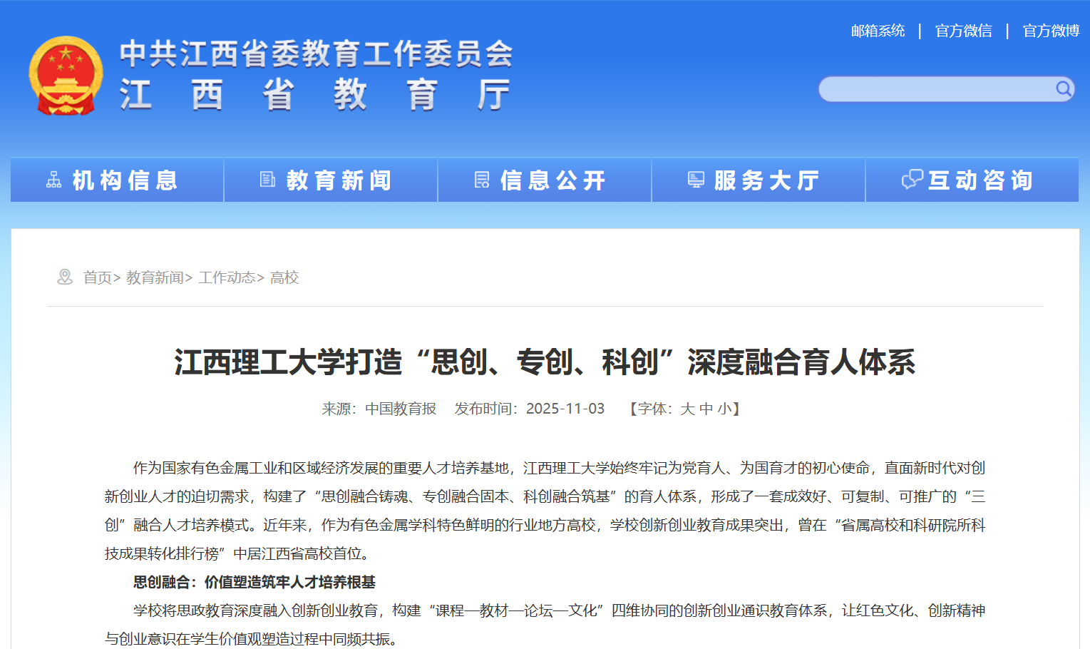 始终牢记为党育人、为国育才的初心使命,直面新时代对创新创业人才的迫切需求,构建了“思创融合铸魂、专创融合固本、科创融合筑基”的育人体系,形成了一套成效好、可复制、可推广的“三创”融合人才培养模式。近年来,作为有色金属学科特色鲜明的行业地方高校,学校创新创业教育成果突出,曾在“省属高校和科研院所科技成果转化排行榜”中居江西省高校首位。