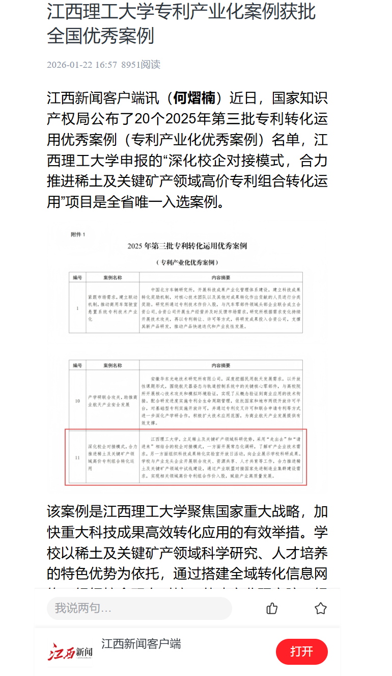 申报的“深化校企对接模式,合力推进稀土及关键矿产领域高价专利组合转化运用”项目是全省唯一入选案例。