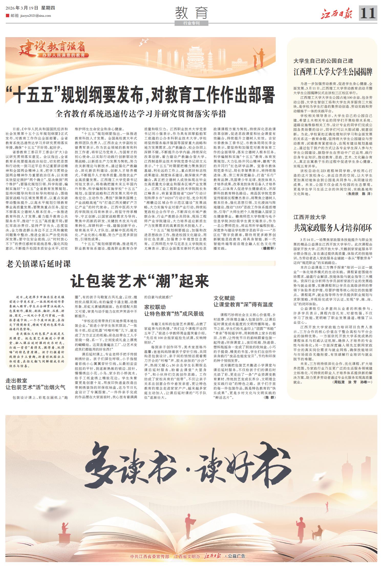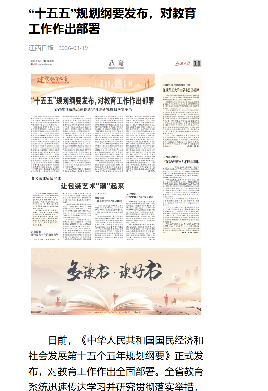 “十五五”规划纲要提出,加强和改进思想政治工作,推进校园文化建设,用好红色资源,加强青少年理想信念教育。江西师范大学马克思主义学院院长尤琳表示,要以全面落实新时代高校思政课课程方案为契机,持续深化思政课改革创新,促进思政课堂和社会课堂有效融合,持续提升立德树人实效。吉安市委教体工委书记、市教体局局长李全胜表示,要坚持和加强党对教育体育工作的全面领导,落实立德树人根本任务,科学编制和实施“十五五”教育、体育发展规划,大力弘扬井冈山精神,擦亮“我的井冈行”红色研学品牌。宜春市教体局党委书记、局长李智勇表示,将持续推进体、美、劳三育深度融合,打造“乐行”教育品牌,巩固青少年足球、竞技体育人才培养成果,改革竞技体育后备人才培养模式,以体育人促进学生健康成长,并深耕科技教育特色路径。南昌医学院党委宣传部部长程赛杰表示,将聚焦立德树人根本任务,强化思想引领、文化浸润与阵地建设,推动“1333”思政工作体系提质增效,引导广大师生把个人理想融入国家卫生健康事业。赣南师范大学物理与电子信息学院2022级学生黄文瑞表示,作为一名公费师范生,将运用所学编程技能,深度参与建设学校数字思政平台——“苏区红”数字资源库,期待用更多跨界创新赋能思政教育,将具身智能、新一代智能终端等前沿理念融入红色文化传播实践。(赣教轩)