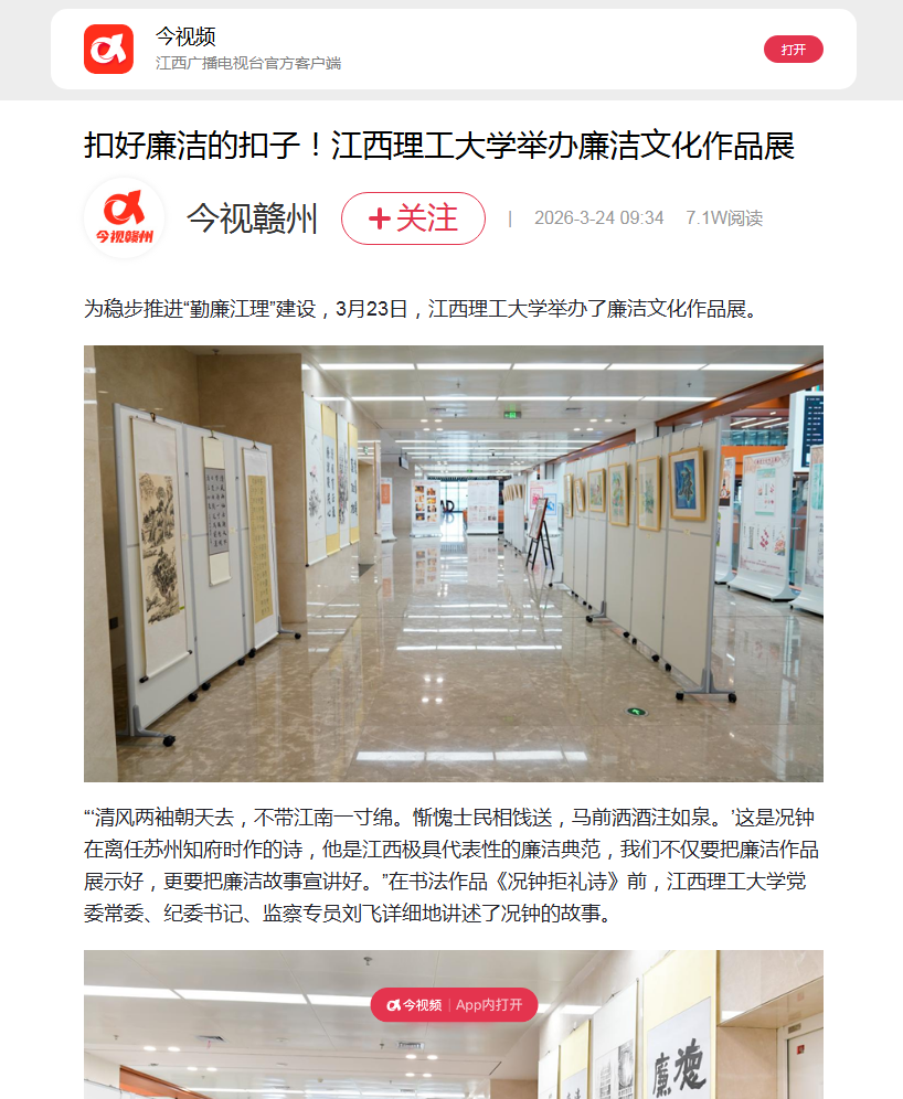 在教育部第十届高校廉洁教育系列活动中的获奖作品、学校师生创作的系列廉洁文化作品及校外优秀廉洁文化作品,作品涵盖书法、绘画、海报、创意设计等形式,既彰显了学校党员干部廉洁自律、担当作为的先锋本色,也承载着青年学子廉洁修身、笃行向善的青春追求。