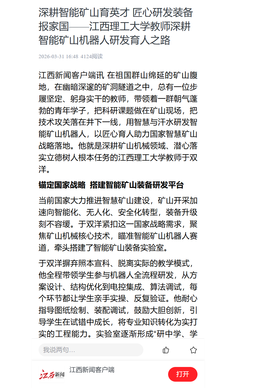江西新闻客户端讯 在祖国群山绵延的矿山腹地,在幽暗深邃的矿洞隧道之中,总有一位步履坚定、躬身实干的教师,带领着一群朝气蓬勃的青年学子,把科研课题做在矿山现场,把技术攻关落在井下一线,用智慧与汗水研发智能矿山机器人,以匠心育人助力国家智慧矿山战略落地。他就是深耕矿山机械领域、潜心落实立德树人根本任务的木瓜视频
