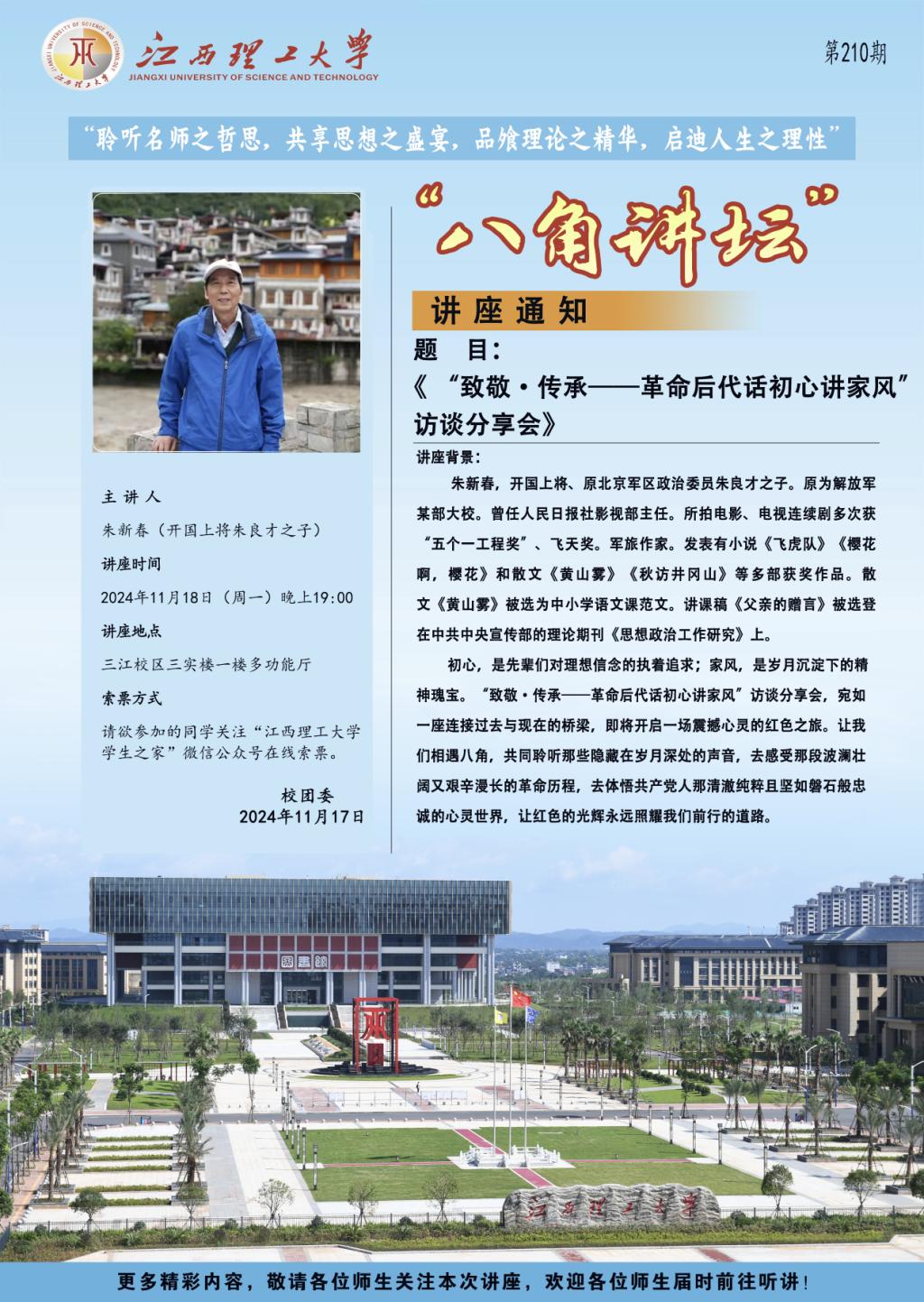 初心,是先辈们对理想信念的执着追求:家风,是岁月沉淀下的精神瑰宝。“致敬·传承--革命后代话初心讲家风”访谈分享会,宛如一座连接过去与现在的桥梁,即将开启一场震撼心灵的红色之旅。让我们相遇八角,共同聆听那些隐藏在岁月深处的声音,去感受那段波澜壮阔又艰辛漫长的革命历程,去体悟共产党人那清澈纯粹且坚如磐石般忠诚的心灵世界,让红色的光辉永远照耀我们前行的道路!