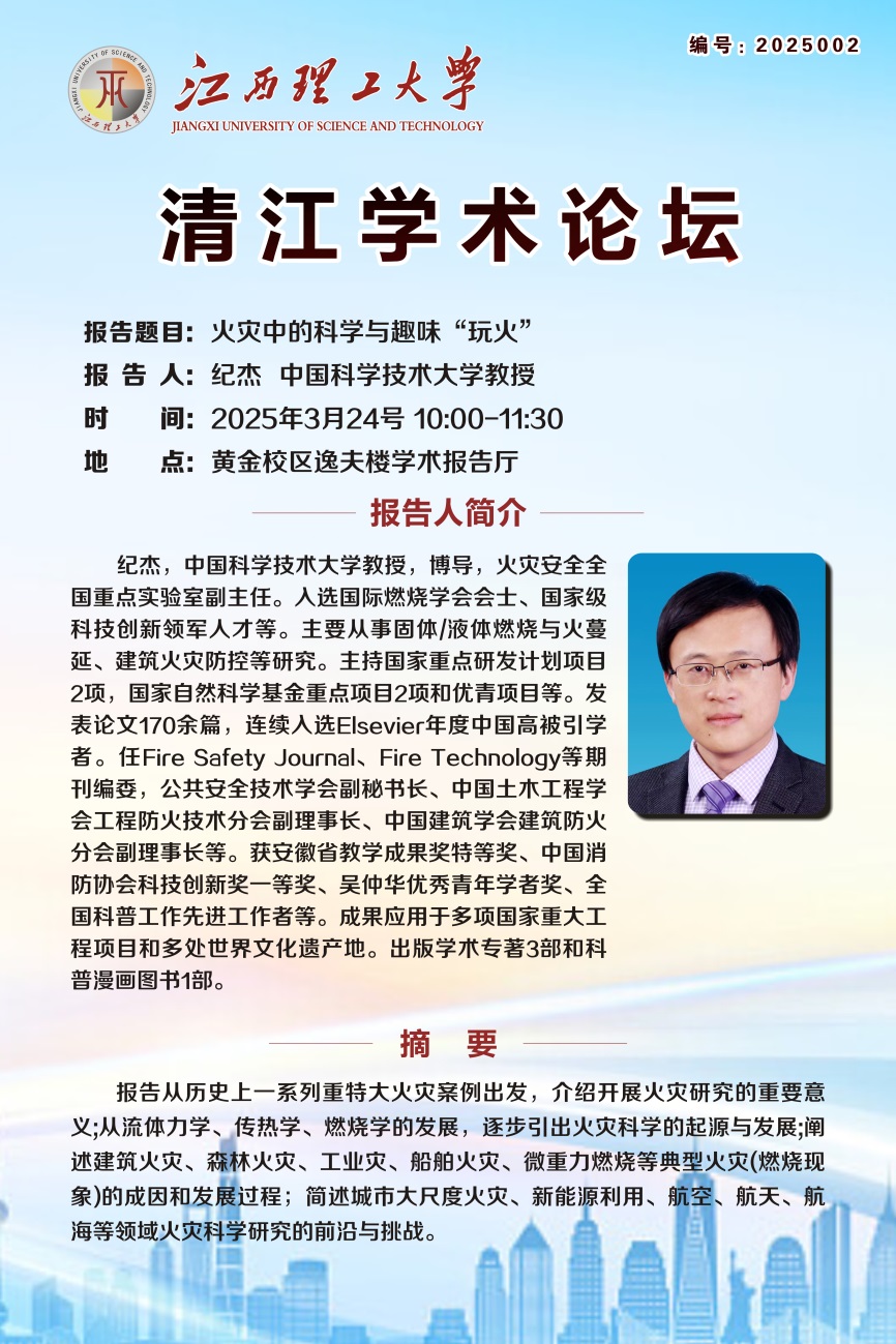 讲座背景:纪杰,中国科学技术大学教授,博士生导师,火灾安全全国重点实验室副主任。入选国际燃烧学会会士、国家级科技创新领军人才等。主要从事固体/液体燃烧与火蔓延、建筑火灾防控等研究。主持国家重点研发计划项目2项,国家自然科学基金重点项目2项和优青项目等。发表论文170余篇,连续入选Elsevier年度中国高被引学者。任Fire Safety Journal、Fire Technology等期刊编委,公共安全技术学会副秘书长、中国土木工程学会工程防火技术分会副理事长、中国建筑学会建筑防火分会副理事长等。获安徽省教学成果奖特等奖、中国消防协会科技创新奖一等奖、吴仲华优秀青年学者奖、全国科普工作先进工作者等。成果应用于多项国家重大工程项目和多处世界文化遗产地。出版学术专著3部和科普漫画图书1部。