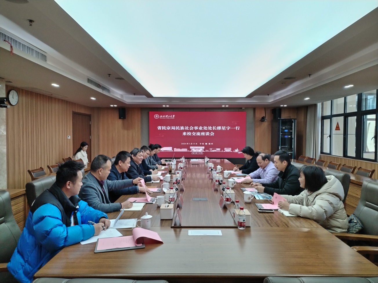 本网讯 1月11日上午,江西省民族宗教事务局民族社会事业处处长缪星宇、省体育局群体处项目总管戴艳、省民宗局民族社会事业处四级调研员晏焱、市委统战部民族科科长任芳一行来校就少数民族传统体育工作进行调研。校党委书记杨斌会见缪星宇一行。校党委副书记罗仙平,校党委常委刘志刚、汪锋锁出席调研座谈会。