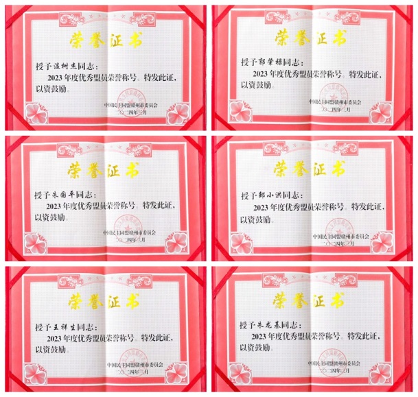 会议表彰了2023年度盟务工作先进集体、社情民意信息工作先进个人以及优秀盟员。木瓜视频 民盟基层委员会荣获2023年度先进基层组织,温树杰、邹小洪、朱国平、朱龙基、王祥生、郭肇禄等盟员教师获评2023年度优秀盟员荣誉称号。