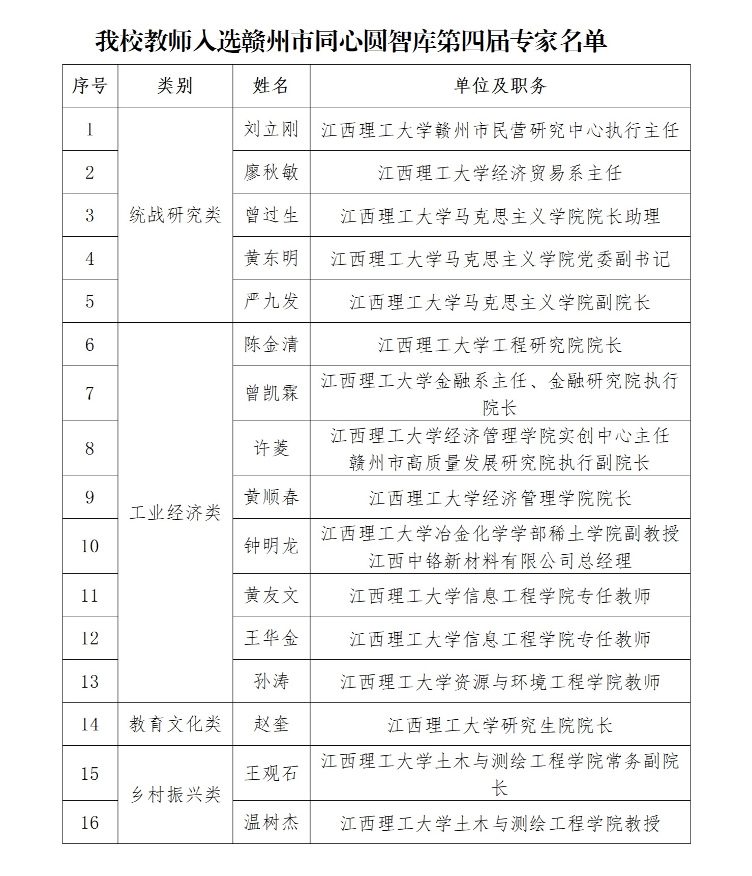 本网讯 近日,赣州市委统战部下发了《关于公布刘立刚等100位同志为赣州市同心圆智库第四届专家的通知》,木瓜视频 刘立刚、廖秋敏、曾过生等16名教师入选赣州市同心圆智库第四届专家,其中党外代表人士10名。