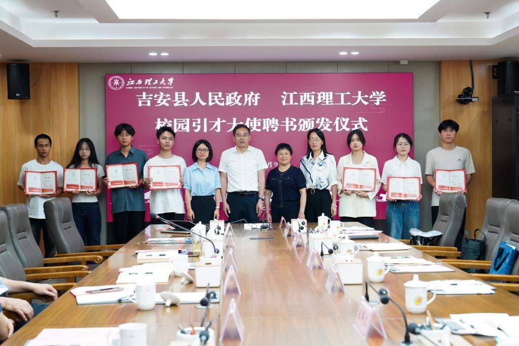 随后,现场举行博士后进站签约仪式。地方企业代表刘莺分别与校人事处副处长李冰、冶金工程学院教师赖卫进行签约。吉安县政协副主席刘筱红为学校引才联络站授牌。吉安县领导为学校八位校园引才大使颁发聘书并合影留念。
