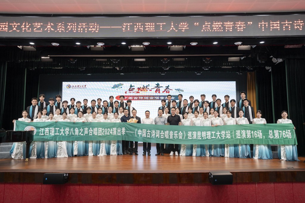 八角之声合唱团受邀参加昆明理工大学“七秩昆工”校园文化艺术系列活动,在呈贡校区西南区公教楼小剧场带去“点燃青春”中国古诗词合唱音乐会第16场巡演,呈现了一场“诗乐和合”的音乐文化盛宴,一堂别开生面的美育思政课。