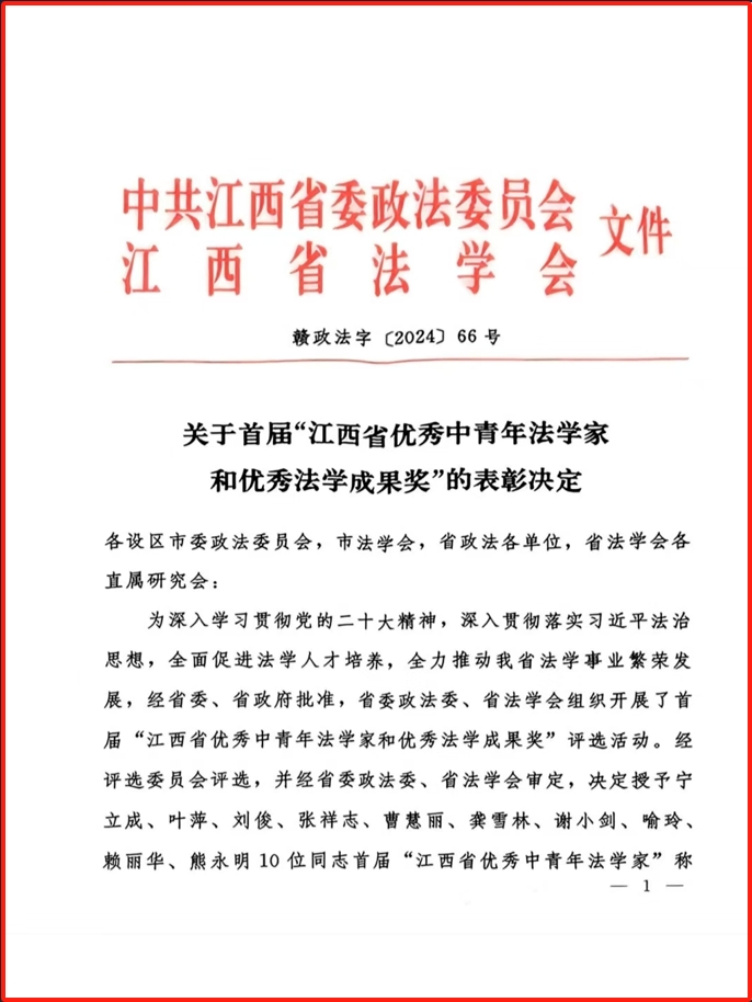 据悉,江西省优秀中青年法学家和优秀成果奖是经省委、省政府批准,省委政法委、省法学会组织开展的评选活动,旨在深入学习贯彻党的二十大精神,深入贯彻落实习近平法治思想,全面促进法学人才培养,全力推动江西省法学事业繁荣发展。首届“江西省优秀中青年法学家和优秀法学成果奖”评选表彰活动历时9个月,评选出“江西省中青年法学家”10名,“江西省优秀法学成果奖”19项,其中著作类7项,论文类12项。