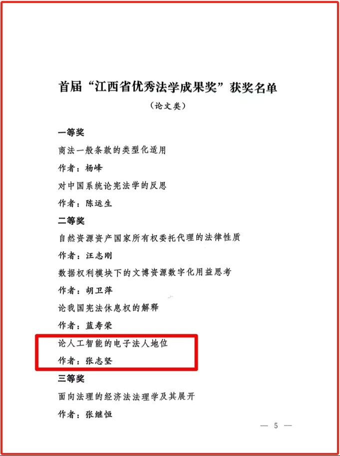 张志坚博士的论文《论人工智能的电子法人地位》获首届“江西省优秀法学成果奖”论文类二等奖。