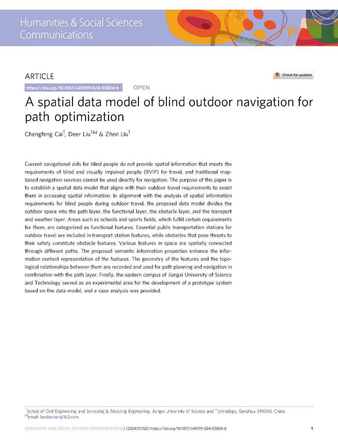 作为独立完成单位,在Nature旗下人文社科子刊《Humanities & Social Sciences Communications》发表了题为“A spatial data model of blind outdoor navigation for path optimization”(一种面向路径优化的盲人户外导航空间数据模型)的研究成果,该研究旨在为盲人导航领域提供一种全局导盲数据范式和数据底座开发途径及应用模式。