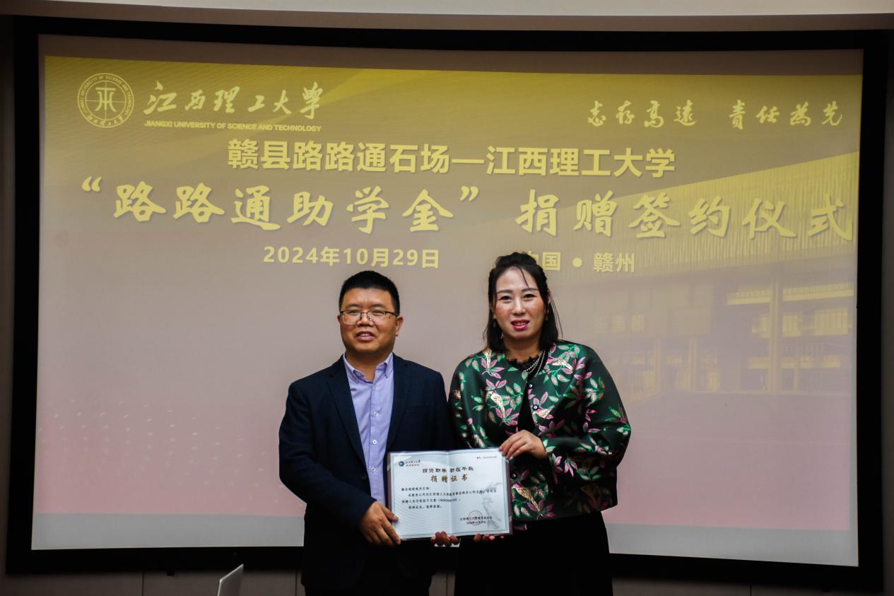 签约仪式上,高丽与许洪胤代表双方签署捐赠协议,刘柏雄为赣县路路通石场颁发捐赠证书。